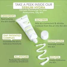 بایۆدێرما سیبیۆم هایدرا شێدارکەرەوەیەکی تایبەتە بۆ پێستی چەور و زیپکە کە وشک بووەتەوە یان توڕە بووە، بەتایبەتی بەهۆی چارەسەری زیپکەی پێستەوە. کاردەکات بە ئاودانکردنەوە و خۆراکدان بە پێست و بەهێزکردنی بەربەستی پێست بە پێکهاتەکانی وەک سیرامیدەکان و هێورکردنەوەی خوران بە پێکهاتەکانی وەک ئینۆکسۆلۆن. هەروەها کرێمەکە یارمەتیدەرە بۆ سنووردارکردنی هەستکردن بە گرژبوون و ڕێکخستنی چەوری و ڕێگریکردن لە گیرانی کونیلەکان، ئەمەش وایکردووە بۆ بەکارهێنانی ڕۆژانە گونجاو بێت.