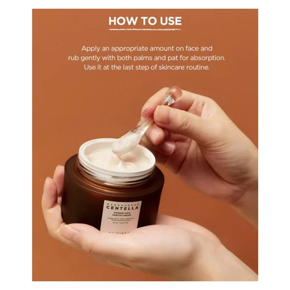 کرێمی Skin1004 Madagascar Centella Probio-Cica Enrich Cream بەکاردێت بۆ خۆراکدان و ئارامکردنەوە و گەڕاندنەوەی بەربەستی پێست، ئەمەش وایکردووە کە گونجاو بێت بۆ پێستی وشک و هەستیار و تووشی پەڵە. خۆڕاگری و لاستیکی پێست بەهێز دەکات بە دابینکردنی ئاوی قووڵ و هاوسەنگی لە سیرامید و ترشە چەوریەکان و فیتۆستیرۆلەکان، هەروەها وەک دوا هەنگاو لە ڕۆتینی چاودێری پێستتدا بەکاردەهێنرێت.